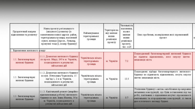Також, за словами Ірини Большак, 16 жовтня Чернігівська міська рада затвердила план відновлення та розвитку громади. У документі одним з проєктів є демонтаж житлового будинку на проспекті Миру, 249. Тобто зруйнованого гуртожитку. Терміном закінчення реалізації цього проєкту вказано вересень 2026 року. Тож люди бояться залишитись без нічого.