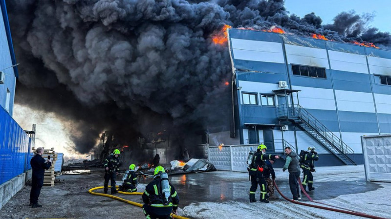 У селі Погреби Броварського району загорілася складська будівля. Попередня площа займання — 5500 квадратних метрів.