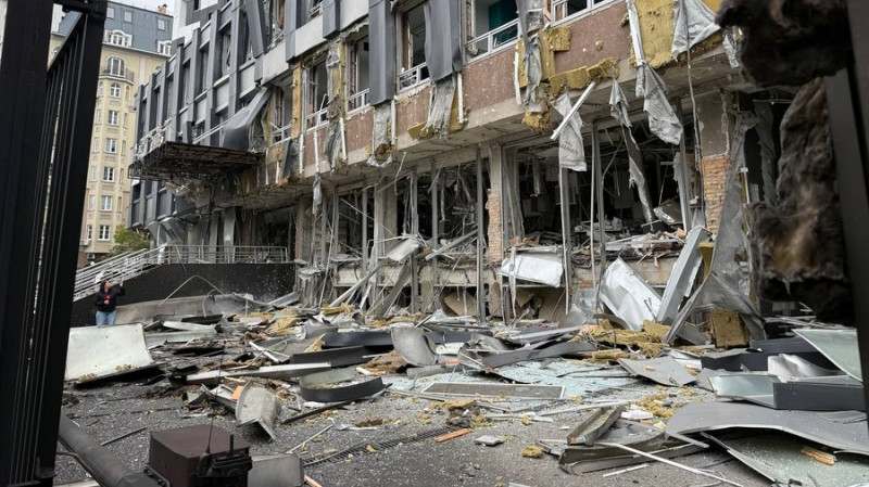 Пошкоджений офісний центр. Наслідки російської атаки у Подільському районі. Київ, 23 жовтня 2025 року. Суспільне Новини/Станіслав Свирид