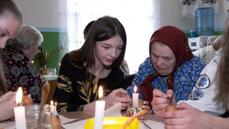 Ліцеїстка та мешканець центру виготовляють писанку. Суспільне Вінниця