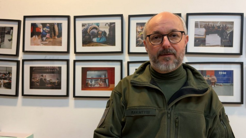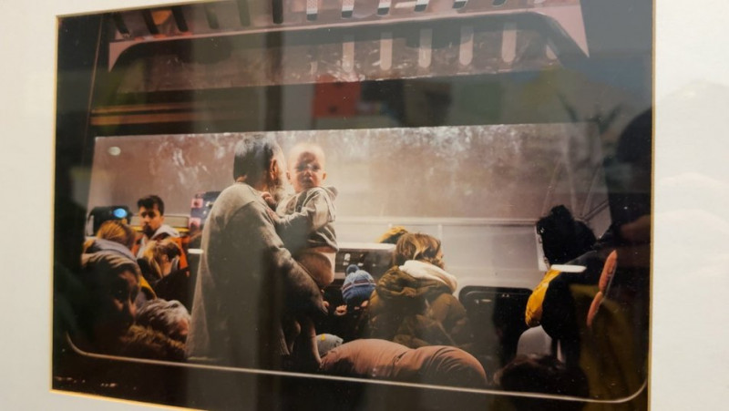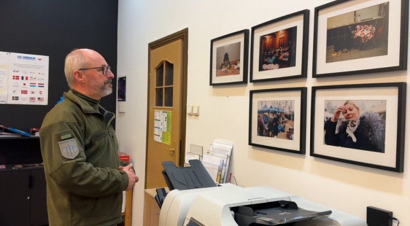 "Тут маємо на стіні світлини з перших днів повномасштабного вторгнення з вокзалу тут в Перемишлі. Це світлини, зроблені нашим другом Адамом Яремком, він з Перемишля також".