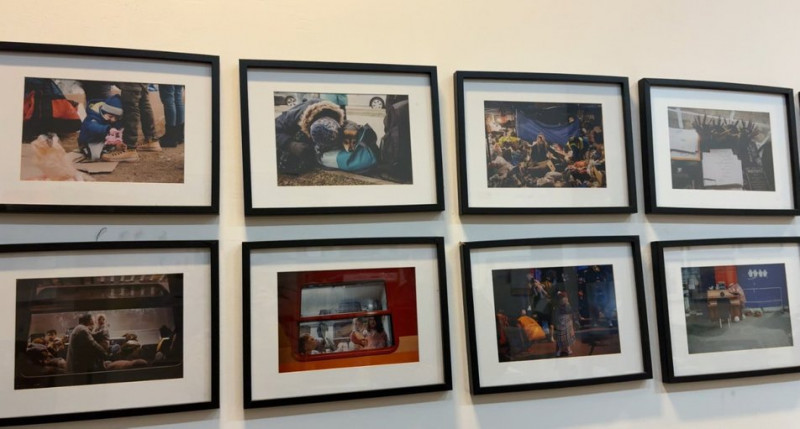 На стінах цього кабінету фотографії українських біженців: люди в потязі, на пероні, біля волонтерських наметів.