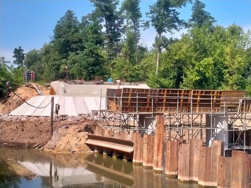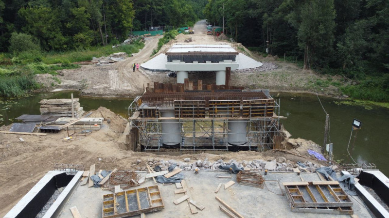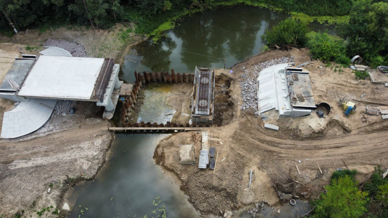 До війни тут був міст металевий, після відновлення буде бетонний. Наразі тут влаштовують один із прольотів прогонової будови. Готовність об'єкту 50%, до кінця року планують завершити і пустити рух транспорту.