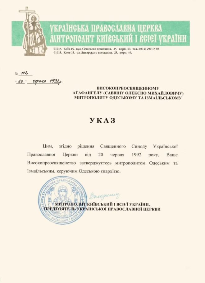 У повідомленні нагадали, що 20 червня 1992 року, рішенням Священного Синоду УПЦ під головуванням блаженноспочилого Митрополита Київського і всієї України Володимира(Сабодана) розпочалася нова сторінка в історії Одеської єпархії УПЦ. «З моменту прибуття Митрополита Агафангела до Одеси церковне життя отримало нове дихання та змінило соціально-культурне буття південного регіону України. Відтоді Церква стала на шлях повноцінного служіння Богу, українському суспільству та людям».