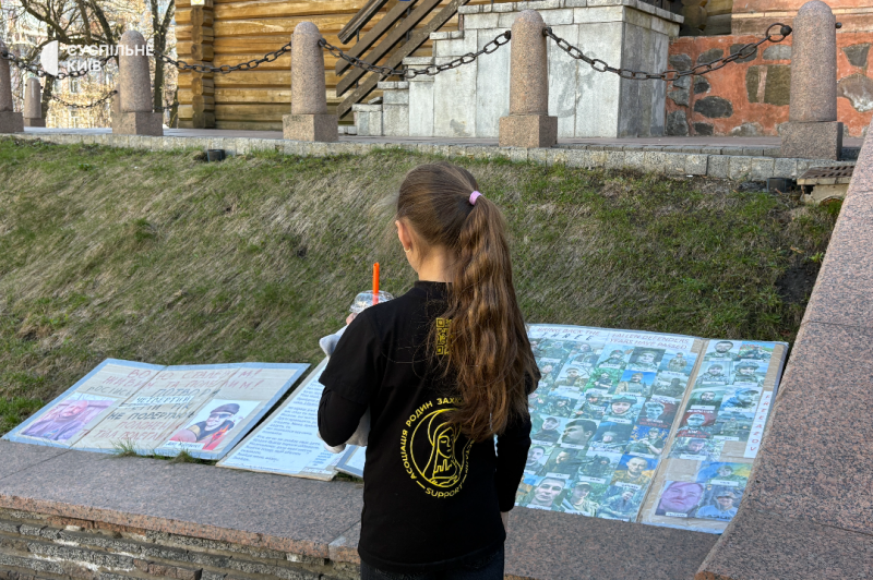 Дівчинка розглядає фото військових, які утримаються в полоні або вважаються зниклими безвісти. Київ, 5 квітня 2026 року. Суспільне Новини/Дар’я Григоренко"Наступного тижня був анонсований великий обмін перед великодніми святами. Ми дуже сильно сподіваємося на цей обмін, дуже на нього чекаємо, чекаємо на всіх хлопців, які перебувають у полоні. Всі ми знаємо, які страшні і нелюдські умови у російських катівнях. Але хлопцям, які перебувають у полоні більше 3-4 років, потрібно повертатися додому якнайшвидше", — сказала Аліна Потапова.