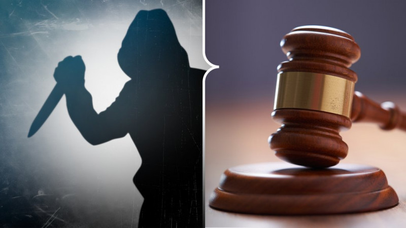 Колаж на якому зображений чоловік з ножем та суддівський молоток. Getty Images