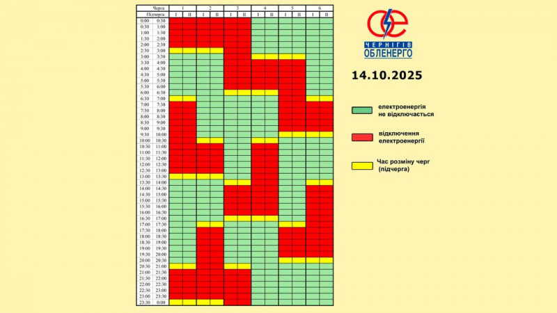 Графік погодинних відключень на 14 жовтня. АТ «Чернігівоблнерго»