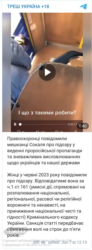У Львівській області судитимуть жінку, яка в маршрутці почала дякувати москві за СРСР і вигукувала, що «України не буде». Місцеві це зняли на відео та опублікували у соцмережах.