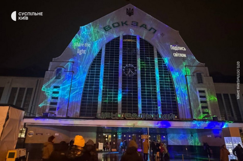На центральному залізничному вокзалі в Києві запрацювала артінсталяція "Поділись світлом". Відкрили її 21-го грудня — у день зимового сонцестояння. Автор проєкту Микола Каблука — український митець, світловий дизайнер, засновник та артдиректор компанії Expolight — присвячує артінсталяцію українцям, які через війну потерпають від відсутності електрики та вимушені боротись із темрявою.