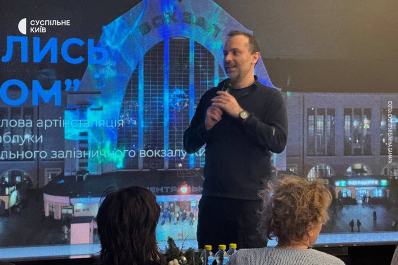 Світловий дизайнер Микола Каблука на відкритті артінсталяції «Поділись світлом» на Центральному залізничному вокзалі в Києві, 21 грудня 2025 року. Суспільне Новини/Анна Самара