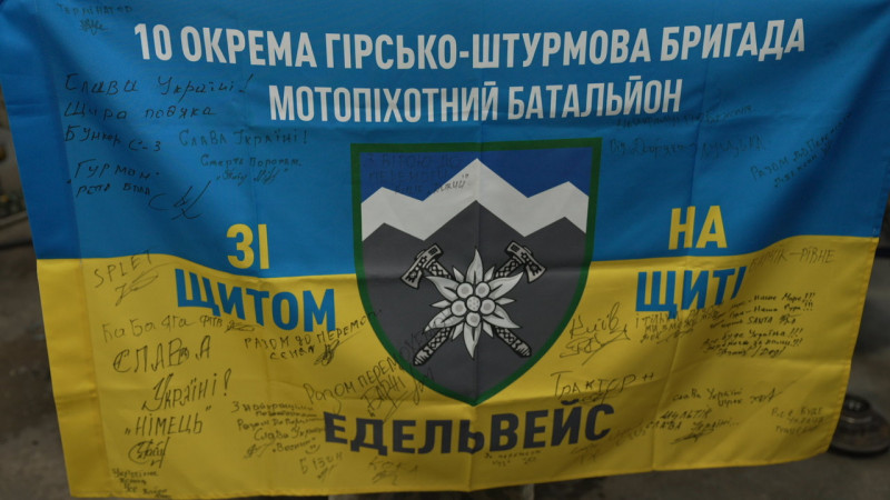За його словами, з ним завжди прапор мотопіхотного батальйону 10-ї окремої гірсько-штурмової бригади "Едельвейс". На ньому підписи його побратимів — тих з ким служить і тих, хто загинув.