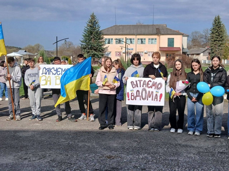 Учні ліцею зустрічають звільненого з полону з плакатами і прапорами. Жуківський ліцей ім. Богдана Лепкого