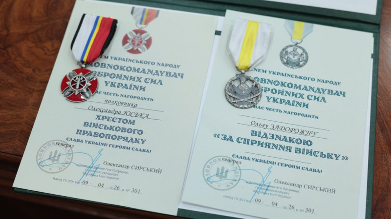 Полковник Олександр Юсько отримав почесний нагрудний знак Головнокомандувача ЗСУ "Хрест військового правопорядку". Ользі Задорожній вручили відзнаку "За сприяння війську".