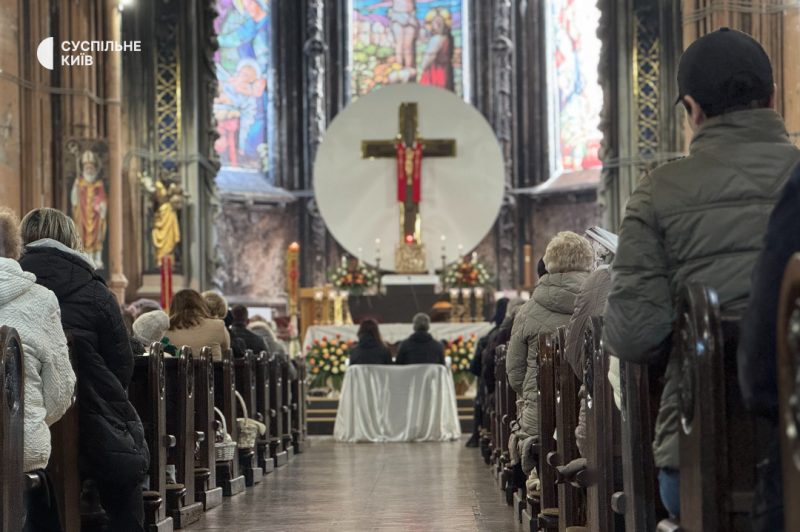 Великодня служба у костелі Святого Миколая. Київ, 5 квітня 2026 року. Суспільне Новини/Нікіта Галка "Традиції звичайні, як на Великдень. Тільки в цьому році на тиждень раніше. Паски, яйця, ходимо до собору католицького, слухаємо проповідь", — каже парафіянка Жанна.