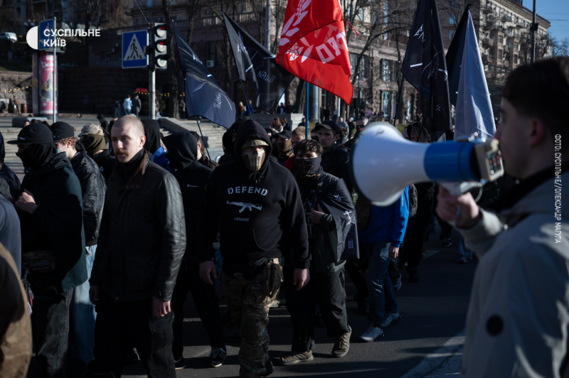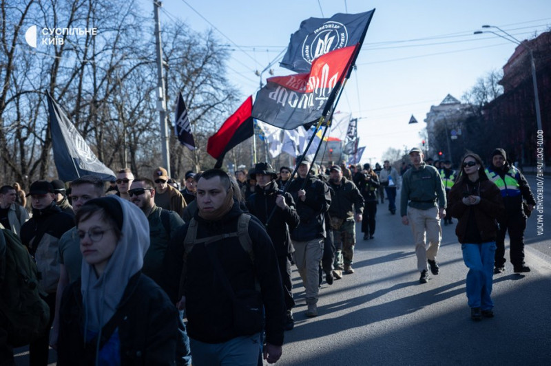 «Єретик» (по центру), учасник маршу до Дня добровольця, Київ, 14 березня 2026 року. Суспільне Новини/Вікторія Пухальська
