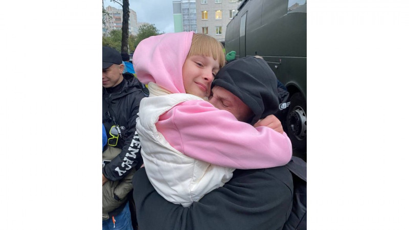 Нацгвардієць Ігор Гацко, який повернувся з російського полону під час обміну 2 жовтня 2025 року, обнімає доньку. Фото із сімейного архіву родини Гацко