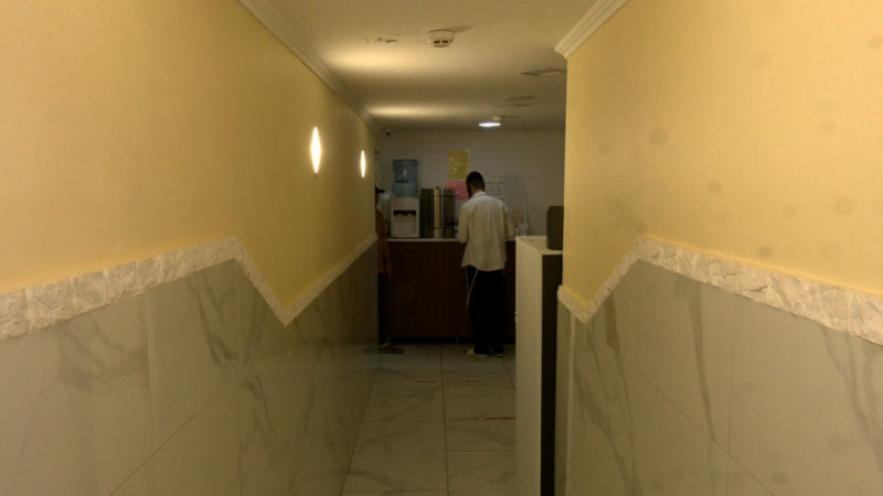 "Є два номери, вбиральня. де попити кави. В повітряну тривогу люди не можуть вийти із залу, але можуть їсти. Є мішки з піском, на випадок, якщо зламається скло. Все за високими стандартами. Пожежники і військові дали добро".