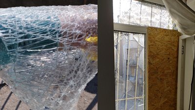 За словами чоловіка, два склопакети в його оселі розбиті вщент, але міцно тримаються завдяки захисній плівці. Зокрема, в одному зі склопакетів вціліло одне скло із трьох.