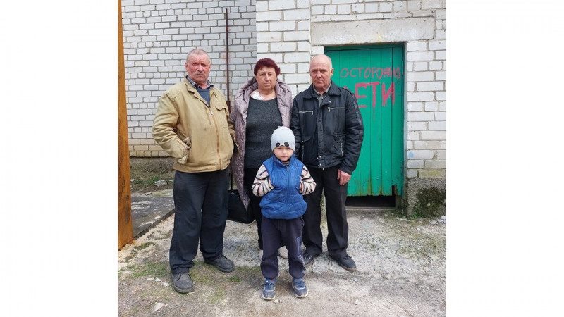 Зліва направо: Іван Польгуй, Любов та Володимир Іващенки з онуком Романом. Фото зробили під час зустрічі біля шкільного підвалу у квітні 2023 року. Суспільне Чернігів