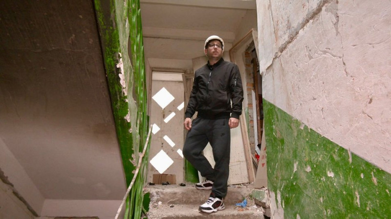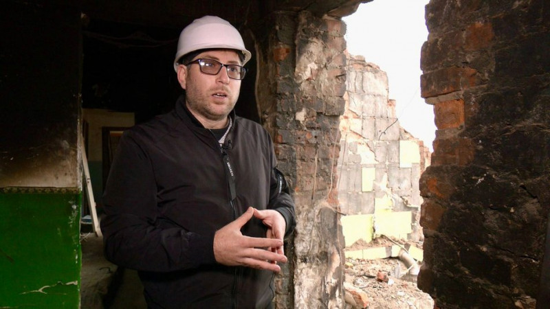 Ігор Черепанський показує двері, які залишилися від квартири. Суспільне Тернопіль