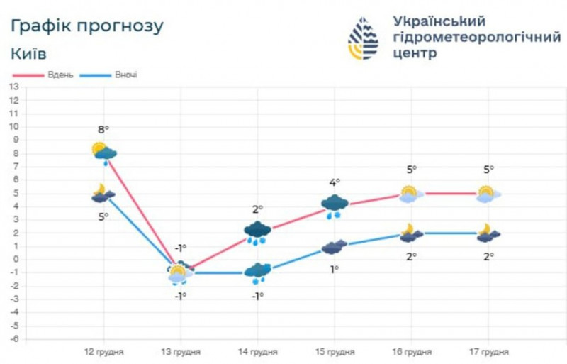 "Після тривалого періоду теплої погоди 13 грудня температура впродовж доби знизиться до невеликих мінусів, а жвавий північно-західний вітер додаватиме відчуття холоду. Проте це найхолодніша доба з майбутньої п'ятиденки, надалі знову розраховуємо на невелике підвищення температури", — йдеться у повідомленні.
