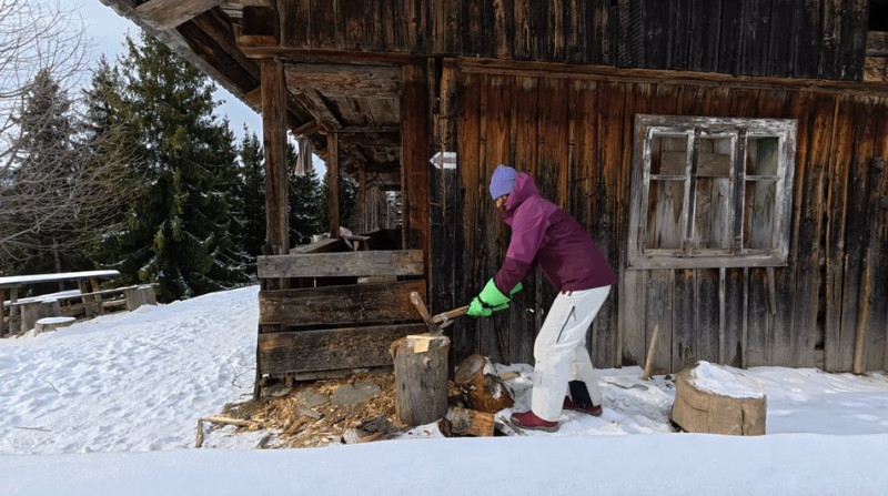Любов заготовляє дрова, аби розтопити піч у хатинці пастухів. Фото надала Любов Бойко
