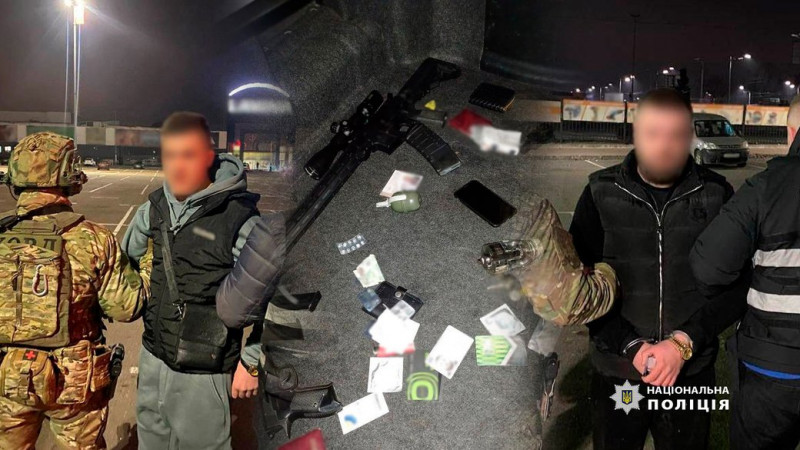 Під час обшуку авто чоловіків слідчі виявили та вилучили пристрій для відстрілу патронів із гумовими кулями ФОРТ-12Р, карабін, імітаційно-тренувальну гранату "Піро-5М", посвідчення начальника з фізичної безпеки приватної установи, посвідчення кореспондента та посвідчення водія-волонтера однієї з громадських організацій.