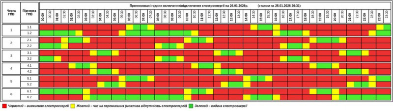 "Згідно вказівки НЕК "Укренерго" 2026-01-26 на території Тернопільської області діятиме Графік погодинних відключень. Графік протягом доби може змінюватися. Просимо слідкувати за оновленнями на нашому офіційному сайті", — написали на facebook-сторінці установи.