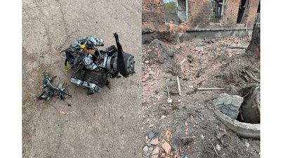 Двигун російського дрона та вирва від вибуху біля одного з об’єктів водоканалу у Ніжині. Олександр Кодола