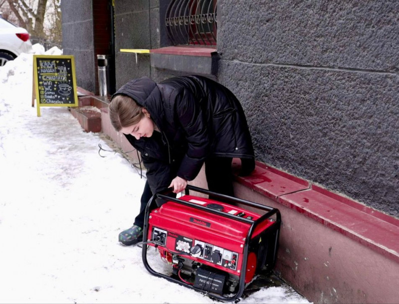 "Важко заводити генератор, особливо важко його транспортувати, бо ми не можемо залишати його на ніч — мусимо забирати в приміщення. Був один-єдиний день, коли було дуже холодно, генератор простояв надворі, й у нас позамерзали паливні фільтри, тому ми були змушені екстрено нести його в приміщення і відігрівати. Раніше ще працювало заведення з ключа — це було досить зручно, але після морозів перестало працювати, і тепер треба заводити тільки вручну. Наш генератор працює на бензині, вдень іде приблизно 12 літрів, якщо є трохи світла. Бо якщо світло лише по годині, то йде до 15 літрів палива, а також масло. За вартістю це може бути від 800 до тисячі гривень на день", — говорить співвласниця кав’ярні Марія Швед.