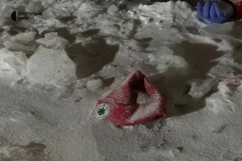 Шапка загиблого медика поруч з його тілом. Київ, 9 січня 2026 року. Суспільне Новини/Нікіта Галка"Вони чергували на місці прильоту. Постраждалих не було і як раз у той момент почав наближатися безпілоткник, вони побігли до укриття і він їх наздогнав, не встигли сховатися", — розповідає завідувач підстанції екстреної медичної допомоги Вадим Віліговчук.