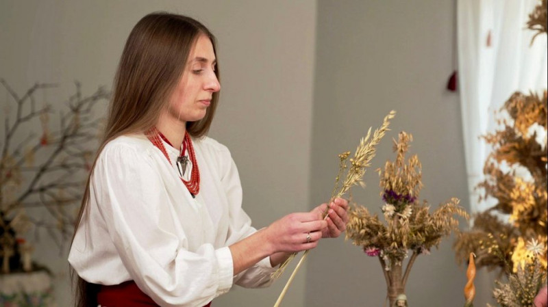 "Це може бути овес, ячмінь, льон, зелена та жовта пшениця. Починаємо робити з вівса, тому що він пишний і з нього виходить гарний хвостик у центрі дідуха. Маємо дивитися на пучки, щоб гілочки були однакового діаметру.