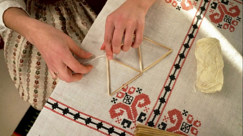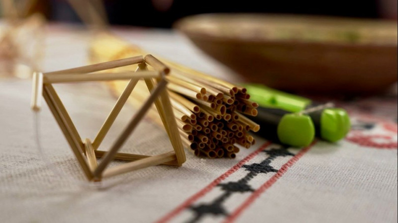 "Спочатку беремо три соломинки, населяємо і зав'язуємо два вузлики. Не потрібно дуже сильно зав'язувати, бо треба, щоб соломинки рухались. Якщо дуже сильно зв'яжемо, вони будуть тріскати".