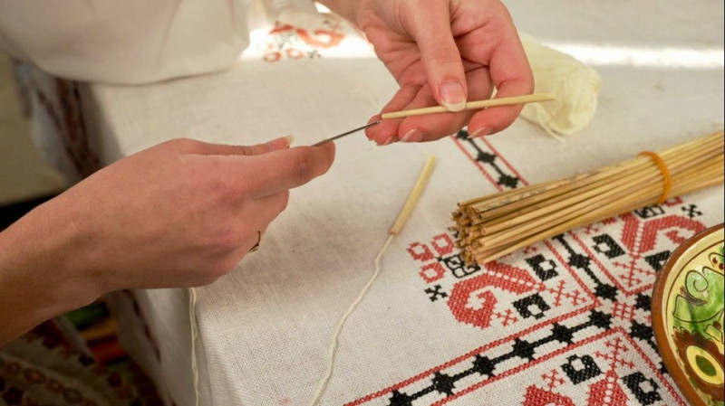 "На майстеркласи ми бермо вже заздалегідь заготовлену солому, нарізану на шматки різних розмірів — є велика, є меншого розміру. Також нам потрібні голки, у мене 18 сантиметрів довжиною, а також є менші, все залежить від розміру соломин. Нитки, якими будемо приплітати все, можуть бути різними, головне, аби були міцними. І також гострі ножиці", — говорить Віта.
