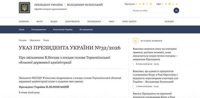 Указ про звільнення голови Тернопільської ОВА. Скрин з сайту офіційного інтернет-представництва президента України