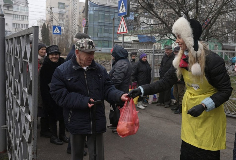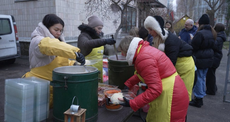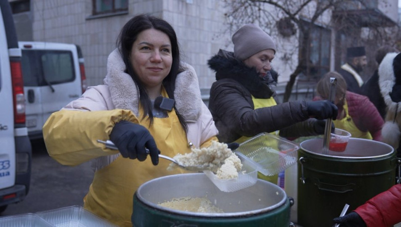 Благодійники проєкту «Жовтий фартух» роздають людям теплі страви. Суспільне Тернопіль