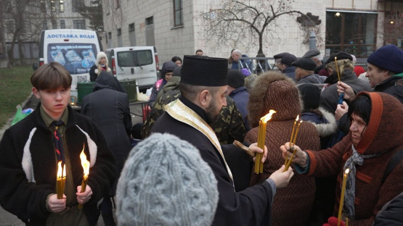 Людям у черзі за обідами передають Вифлеємський вогонь миру. Суспільне Тернопіль