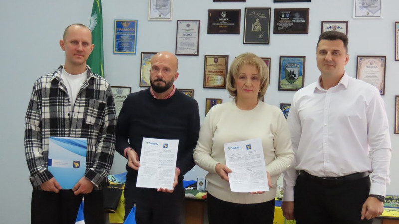 Представники Прилуцької міської ради та благодійного фонду Solidarity з Франції тримають меморандум про співпрацю. Прилуцька міська рада