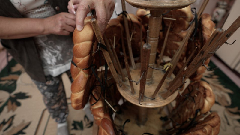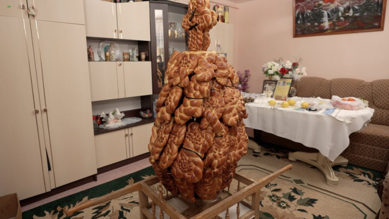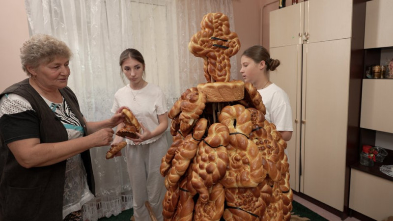 Разом з онучками Тетяною та Оксаною заносять до хати деревʼяний каркас, на який будуть ставити калачики. Зазвичай такі каркаси зберігають у церквах. Їх робили з ялиці, бо вважали, що так тягнуться до неба й вірили у вічне життя. Через це й зараз деревце одягають у зелень – додають гілки ялиці, туї чи аспарагуса.