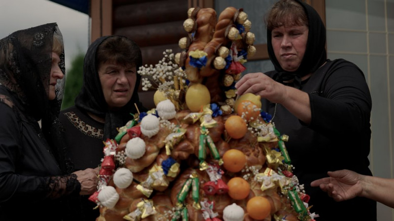 Жінки розбирають поминальне деревце на похороні у селі Петричанка — відтак калачі та солодощі роздають людям. Суспільне Чернівці"Кожна фігурка зображує все, що дороге і солодке в земному житті для людини, яка йде у вічність. Вона має легко попрощатися з усім і її душа повинна відлетіти. Як би їй не хотілося бути тут, вона має відпустити цей світ, а світ має відпустити її", – каже етнографиня Іванна Стефʼюк.