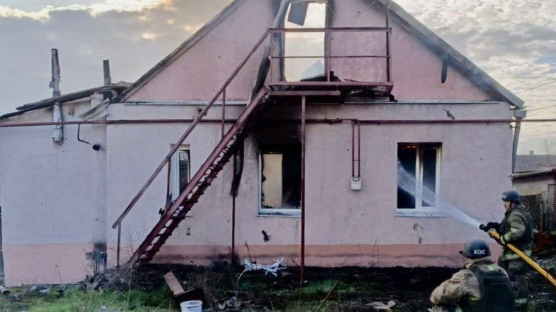Пожежники гасять займання будинку, що виникло через атаку РФ, Нікопольщина, 27 березня 2026 року. Олександр Ганжа/Telegram