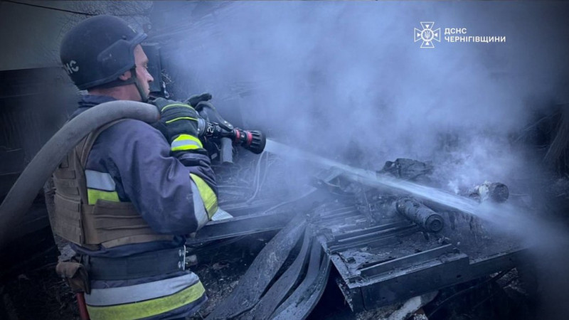 Рятувальник гасить пожежу, яка виникла внаслідок атаки російського БпЛА 30 листопада 2025 року. ГУ ДСНС в Чернігівській області