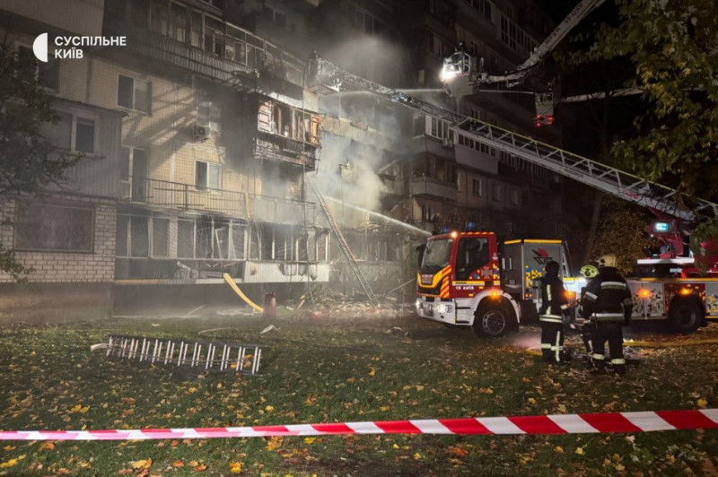 Ліквідація пожежі у багатоповерхівці у Деснянському районі, що виникла внаслідок дронової атаки РФ. Київ, 26 жовтня 2025 року. Суспільне Новини/Дарина Коломієць