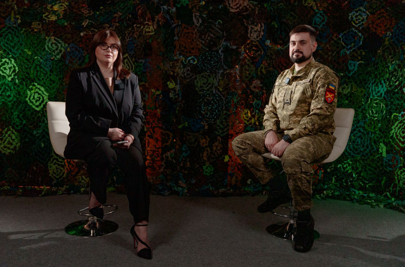Журналістка Суспільного Богдана Савицька і начальник відділення комунікацій 44-ї артилерійської бригади Максим Коломієць. Суспільне Тернопіль"Рушниці — наразі найефективніший спосіб збиття ворожих дронів".