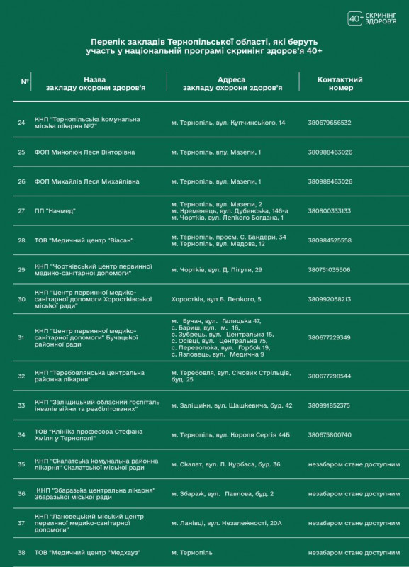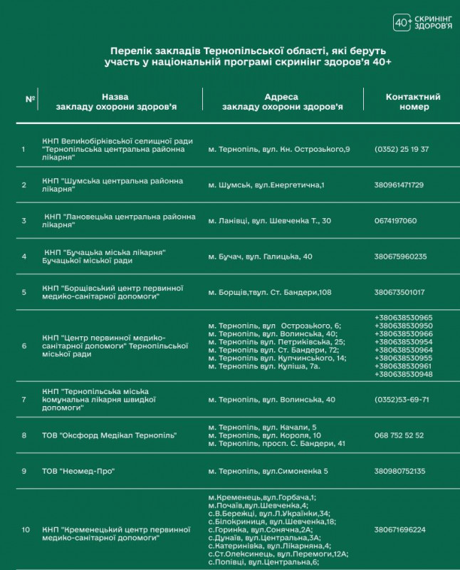 Медзаклади, де можна податися на програму «Скринінг здоров’я 40+» на Тернопільщині FB/Департамент охорони здоров’я Тернопільської ОВА
