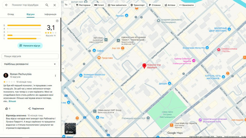 Cкриншот з відгуком Романа про діяльність психолога Ігоря Шурубури. Google Maps