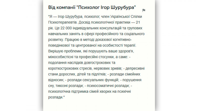 Відгук в Google Maps від компанії «Психолог Ігор Шурубура» Google Maps