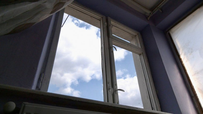 Михайло Марщівський показує вікно, яке затягнув плівкою. Суспільне Тернопіль