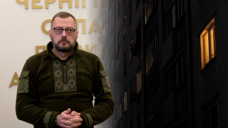 Колаж, на якому зображений В’ячеслав Чаус та будинок, у якому горить світло. Суспільне Чернігів