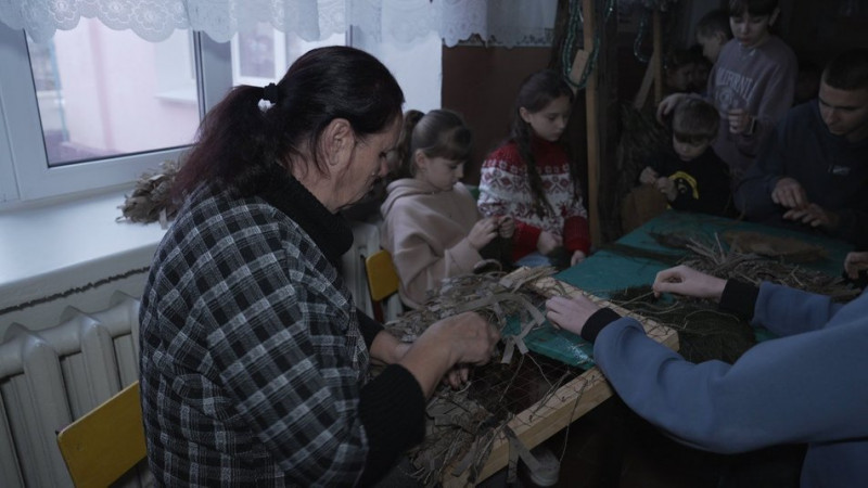 Директорка закладу Олена Катеринич розповіла нам, що плетіння кікімор та нашоломників у сільському ліцеї — це частина щоденної роботи. Школярі до неї долучаються на перервах та після уроків. За словами жінки, готові вироби передають волонтерам, а ті везуть їх захисникам.